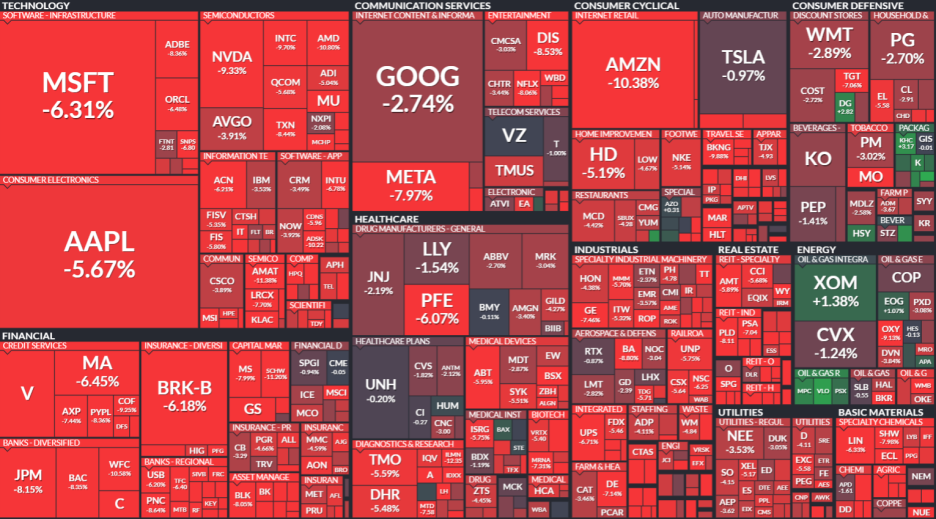 - 높은 인플레이션으로 인해 예상보다 큰 폭의 금리 인상이 진행될 것이라는 전망에 미국 시장은 크게 하락했습니다.